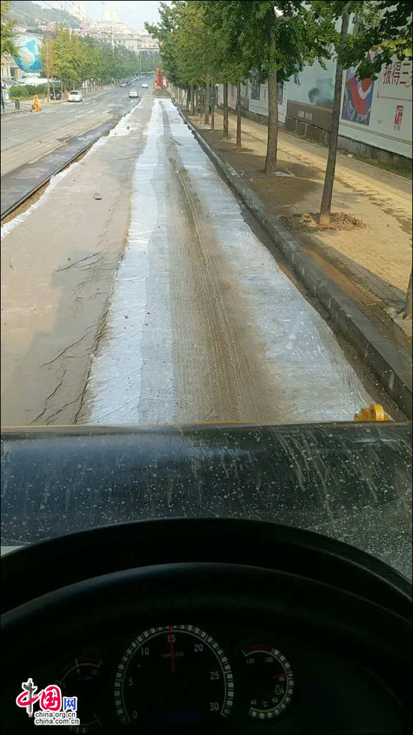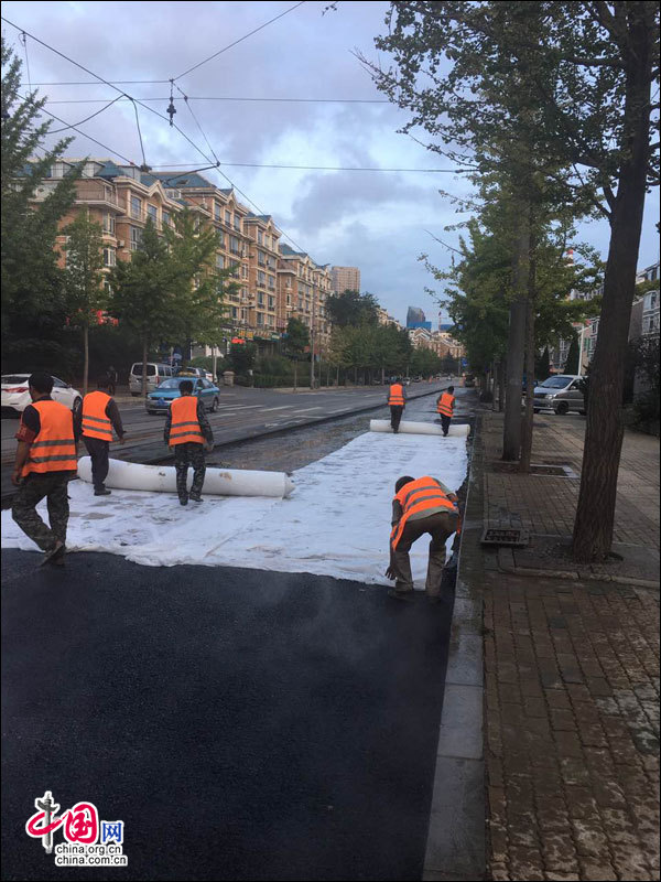 中国网8月22日讯 近日细心的辽宁大连市民不难发现,在大连市许多新修道路的路面上都铺着厚厚的一层白布,车辆在此经过时扬尘大大减少。原来,这是城建部门为了最大程度降低道路维修时产生的扬尘污染,采用的抑尘新“神器”、新办法。