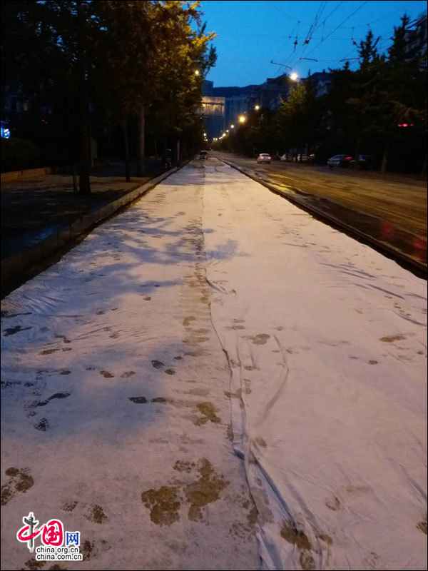 在鲁迅路华乐街路口,中国网看到自此向西,被挖开的路面上都盖上了一层白色苫布,一眼望不到头,车辆经过时,没有了漫天扬尘。现场的施工负责人刘经理介绍说,今年大连市城建局对道路施工单位提出硬性施工要求,必须对碎石路面采用土工布进行苫盖,以减少扬尘。截至目前,他负责的从春海街至东港商务区共18000余平米的施工路面,已经全部苫盖了土工布。