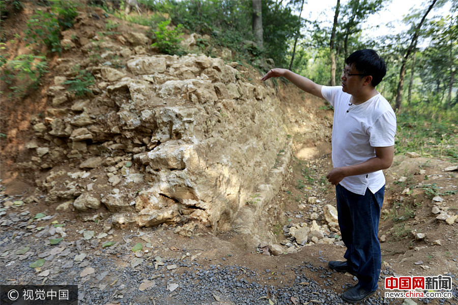 2017年8月22日,工作人员谭勇在介绍考古发掘出来的南宋古城墙。(周海军/视觉中国)