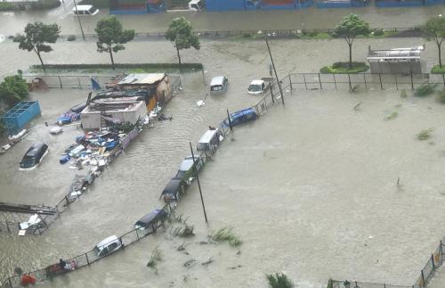 澳门内港和青洲一带低洼地区,大面积出现水浸,水深及胸,不少停在路边的私家车几乎没顶。由于海水倒灌,水浸漫延得很快,不少驶到附近的车辆走避不及被困,亦有原本开门的超市来不及落水闸而被水浸。