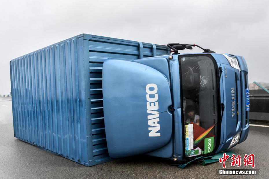 8月23日,珠三角环线高速上,一辆货车被“天鸽”带来的大风掀翻,司机躲在车内避雨。 中新社记者 陈骥旻 摄