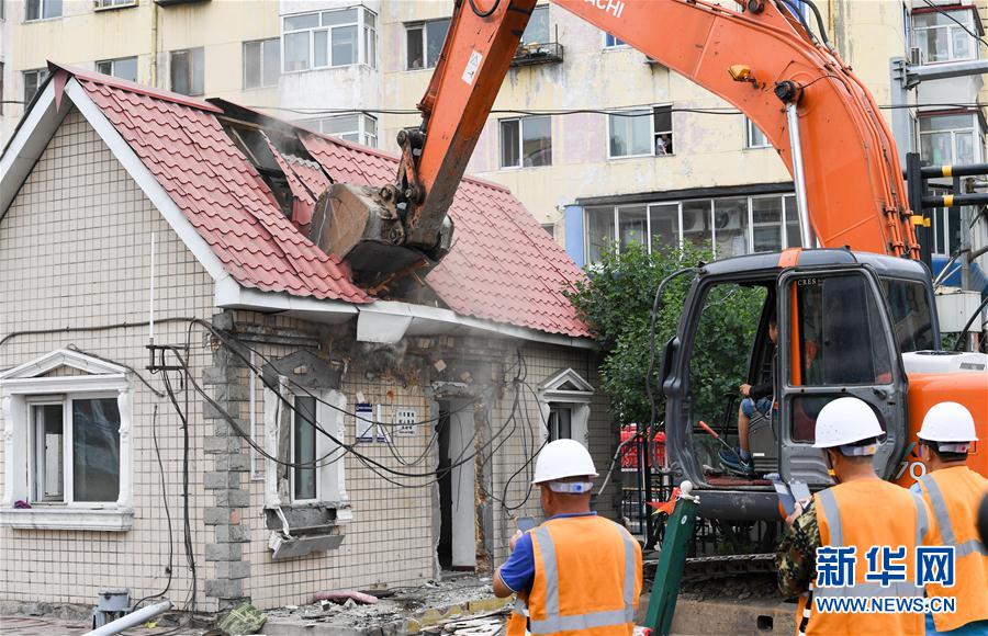 8月23日,工作人员操作工程车辆拆除滨绥线3KM041M铁路道口房。新华社记者 王松 摄