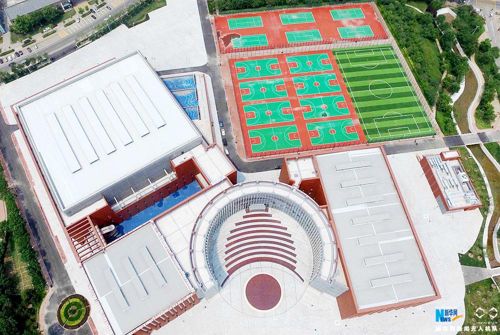 第十三届全运会将于8月27日在天津开幕,图为航拍天津科技大学体育馆。天津科技大学体育馆是第十三届全运会新建场馆之一,将承办蹦床和艺术体操项目比赛。新华社记者岳月伟摄