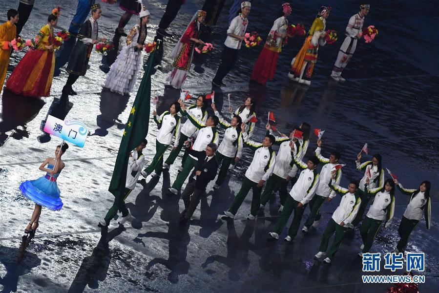 8月27日,第十三届全国运动会开幕式在天津奥林匹克中心体育场举行。 这是澳门特别行政区代表团进入开幕式现场。 新华社记者白禹摄图片来源:新华网