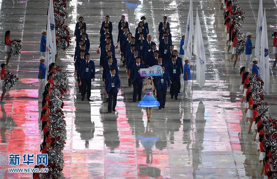 8月27日,第十三届全运会裁判员代表方队在入场仪式上。当日,中华人民共和国第十三届运动会开幕式在天津举行。 新华社记者潘昱龙摄图片来源:新华网