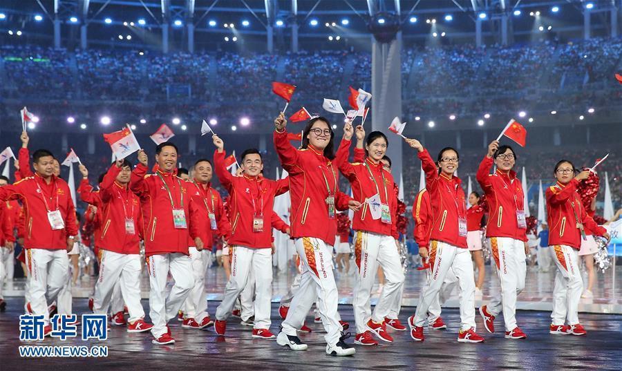 8月27日,浙江体育代表团运动员傅园慧(中)等在运动员入场仪式上。当日,中华人民共和国第十三届运动会开幕式在天津举行。新华社记者曹灿摄 图片来源:新华网