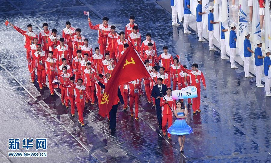 8月27日,山东体育代表团在运动员入场仪式上。当日,中华人民共和国第十三届运动会开幕式在天津举行。 新华社记者黄宗治摄图片来源:新华网