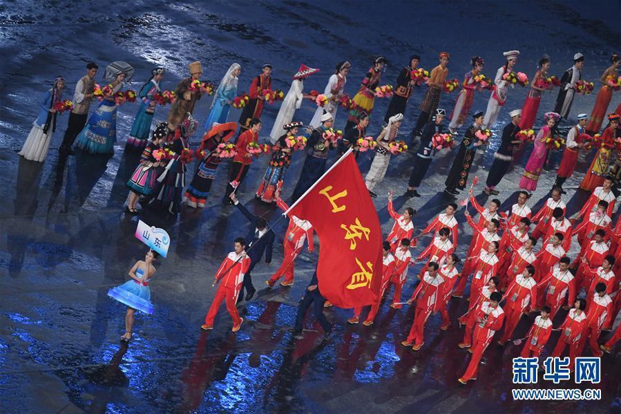 8月27日,第十三届全国运动会开幕式在天津奥林匹克中心体育场举行。 这是山东代表团进入开幕式现场。 新华社记者白禹摄图片来源:新华网