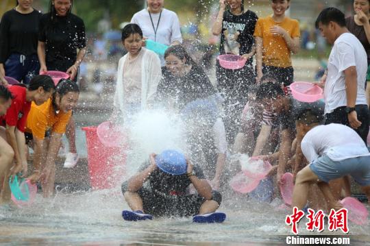 水龙狂欢现场,青年男女互相泼水为戏,用脸盆、水瓢乃至水桶盛水,嫔戏追逐,逢人便泼。民间认为,这是吉祥的水,祝福的水,可以消灾除病,所以人们尽情地泼,尽情地浇,不论泼者还是被泼者,虽然从头到脚全身湿透,但还是异常高兴。