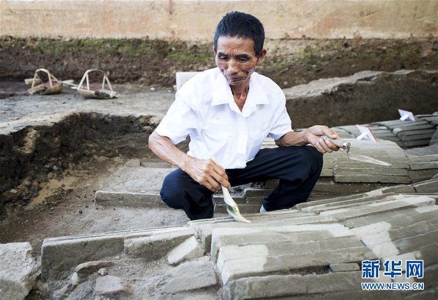 8月28日,一名工人在汤显祖家族墓园的考古工作现场进行清理工作。