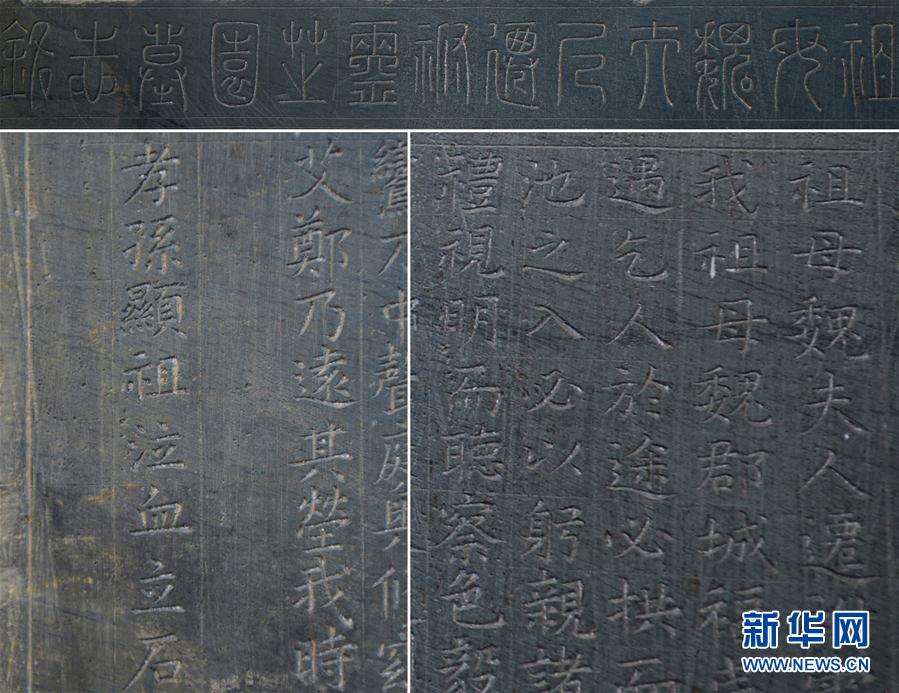 8月28日拍摄的汤显祖祖母魏夫人墓志铭碑文(局部细节图),墓志铭由汤显祖亲自撰文或书丹(拼版照片)。