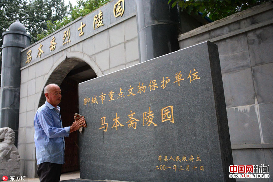 2017年8月31日,山东莘县,蔡恩坤老人每天清早都要擦拭好多遍门前石碑。王登虎/东方IC