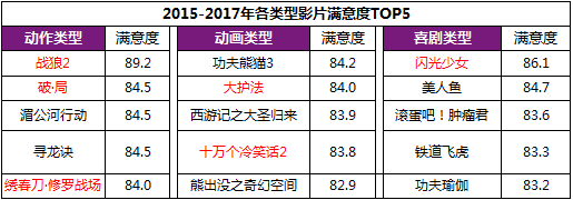 动作影片为2017年暑期档的第一大类型影片,贡献了超六成的票房。《战狼2》巧妙的将“京式”功夫打斗融入军事战争题材中,《破∙局》用拳拳到肉、极具写实感的“洗手间打斗戏”等动作桥段来凸显影片的强节奏叙事,两部影片以高口碑位居历史调查的26部动作影片满意度前两位。《绣春刀∙修罗战场》延续同系列影片的武侠动作风格,口碑不俗,位居调查过的动作类影片满意度第5位。