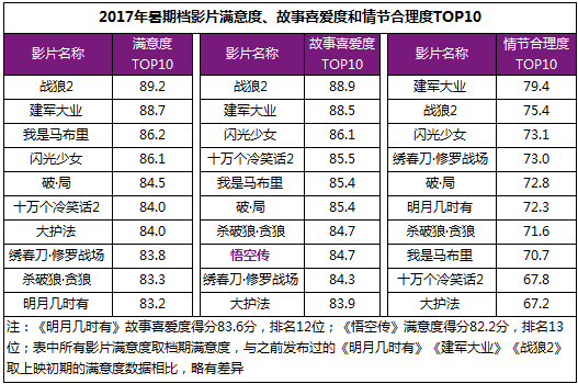2017年暑期档,我们看到了满意度高分和票房奇迹,也看到了电影消费类型的多元化和影视工业技术的进步,更重要的,我们看到了影市竞争的日趋理性和规范,那些用尽诚意、质量过硬、思想深远的优质作品终能闪光。