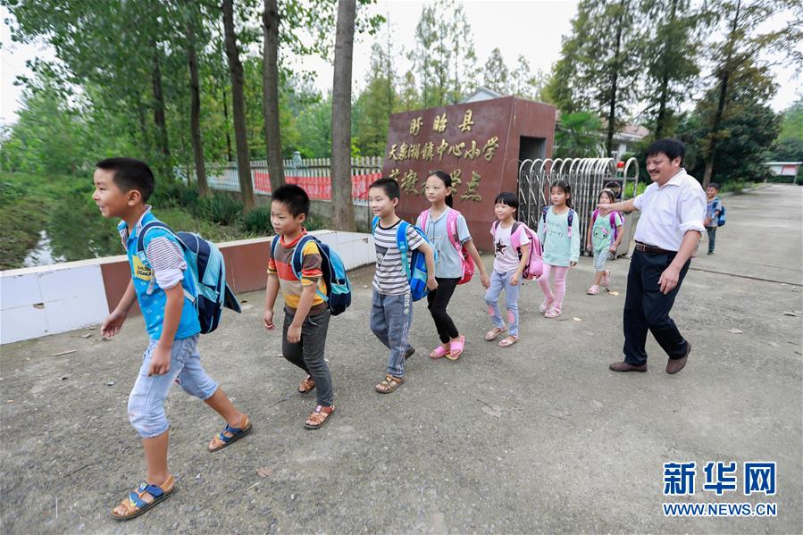 9月6日,江苏省盱眙县天泉湖镇范墩教学点的教师周明功带着学生们回家。新华社发(周海军 摄)