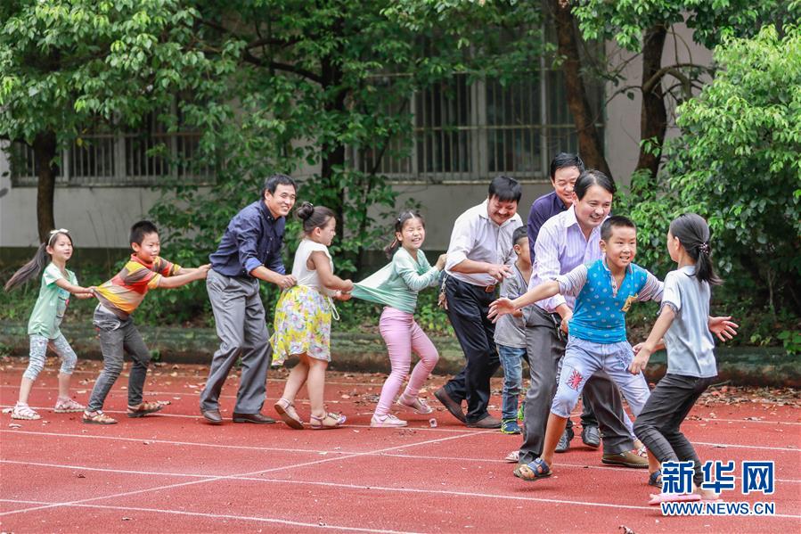 9月6日,江苏省盱眙县天泉湖镇范墩教学点的教师和学生在操场上玩“老鹰抓小鸡”游戏。新华社发(周海军 摄)