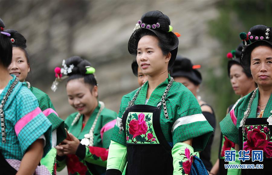当日,在贵州省黔东南苗族侗族自治州丹寨县南皋乡石桥村一年一度的苗族传统节日“吃新节”上,数千名苗族同胞在节日中展示各村寨多姿多彩的苗族盛装服饰。2008年6月,丹寨苗族服饰被列为第二批国家级非物质文化遗产代表性项目名录。新华社发(黄晓海摄)