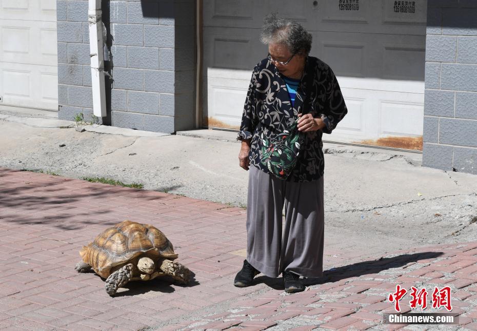9月7日,长春市民郝玉兰将自己饲养十年的乌龟“苏苏”带出笼子晒太阳。今年83岁的郝玉兰十年前去云南旅游的时候买了一只不足半斤重的小乌龟,并起名叫“苏苏”。十年时间这只乌龟已长到百余斤,每天郝玉兰都会带着乌龟出门晒太阳,邻居称她为“乌龟奶奶”。中新社记者 张瑶 摄