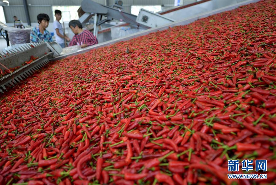 这是9月7日在湖北鹏博生态农业有限公司的车间里拍摄的生产线上的辣椒。这些鲜辣椒经过24小时的烘烤后将变成可以出售的干辣椒。