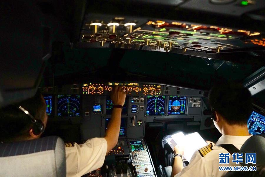 9月8日,东方航空公司的责任机长尚峰(右),机长曲伟成(左)在驾驶空客A320,进行验证飞行。新华社记者 邢广利 摄