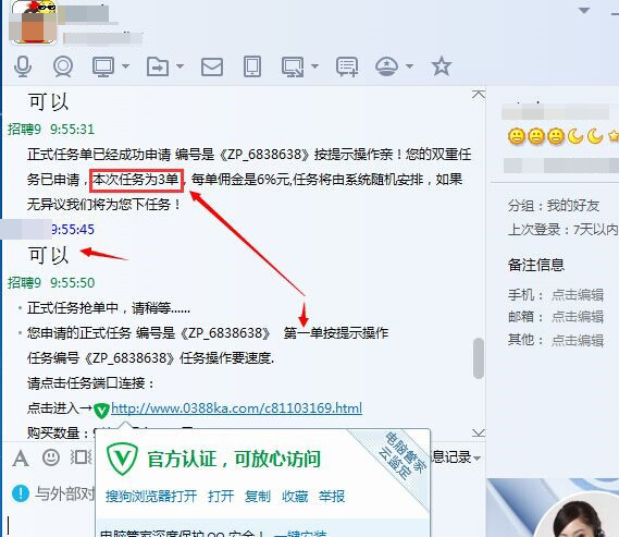 孟飞保留的QQ聊天记录与截图显示,他联系短信所留QQ号之后,自称为客服的人员介绍,客服会发给刷单者任务单,里面包含了要拍下的商品链接和对应的注意事项和说明,刷单者拍下并付款之后,商家会将货款和报酬支付到刷单者的网银或支付宝,