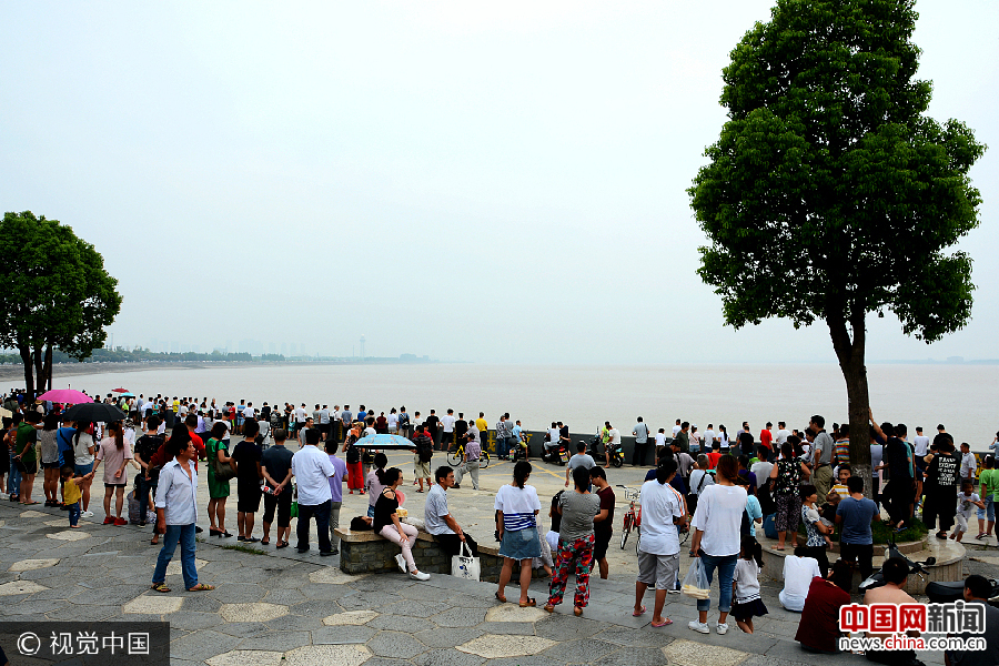 2017年9月9日,农历七月十九,浙江省杭州市江干区下沙七格村汹涌的钱江潮水冲上江堤,吸引许多市民观潮。农历七月十八左右的钱塘江潮水又称“鬼王潮”,气势、涌高有时甚至超过八月十八的大潮。汪建春/视觉中国