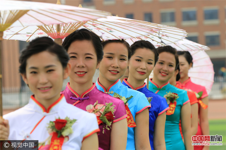 婚礼仪式上,新娘们身着旗袍,新郎们身着中山服 ,分别从"鹊桥"两侧入场。在充满民国情调的音乐伴奏下,主持人深情诵读新人们的爱情宣言,并 颁发民国风的"婚书",新人们放飞祝福彩蝶,现场气氛十分浪漫。婚礼现场的游戏环节,"默契问 答""猜唇印" …… 游戏输家被"罚"抱起新娘绕 台三圈,平日里的辛勤园丁现场实力秀了一把恩爱 。"天上四时春作首,人间百行孝为先。"新人沿袭传统行拜堂礼,感谢含辛茹苦养育自己的父母,对自己的关怀和培养的亲朋,以及到场祝福的来宾。