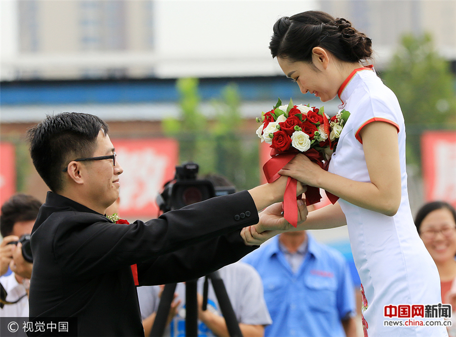 2017年9月10日第 33 个教师节,石家庄一所中学在学校操场上举办校园集体婚礼。全校教职工、新人亲属一同见证了7对新人的幸福时刻。