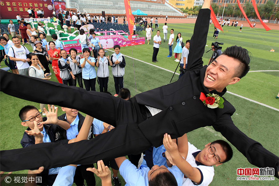 2017年9月10日第33个教师节,石家庄一所中学在学校操场上举办校园集体婚礼。全校教职工、新人亲属一同见证了7对新人的幸福时刻。