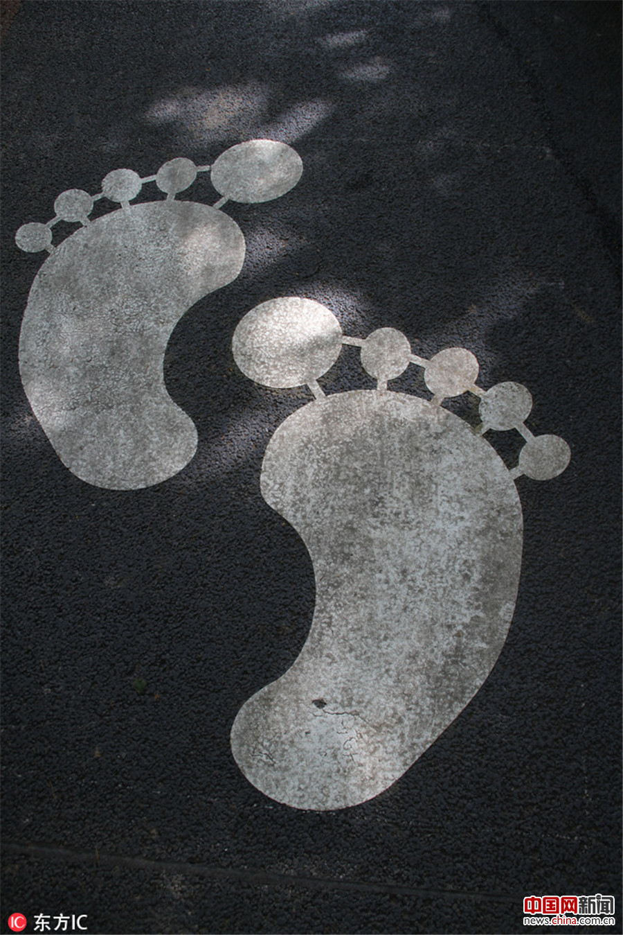 2017年9月10日,山东济南马鞍山路上,马路路面被涂鸦众多巨型“大脚丫”,提醒市民与自行车各行其道,这一趣味警示标志吸引路人回头观望。(陈宁/东方IC )