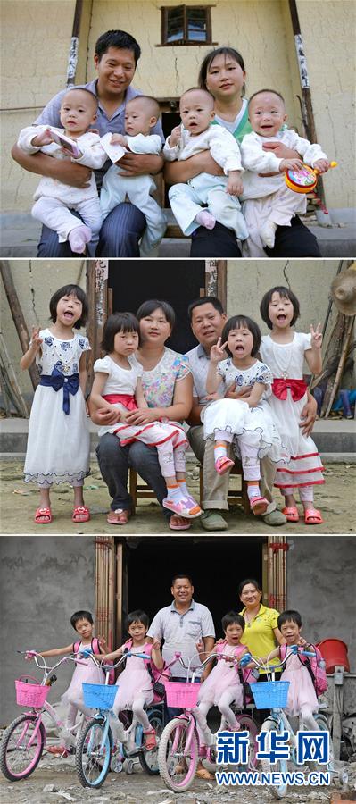 吴年有夫妇和四胞胎女儿的合影:上图为2011年9月14日摄于家中土坯房前;中图为2016年5月25日摄于家中土坯房前;下图为2017年9月7日摄于家中在建的三层小楼前(拼版照片)。