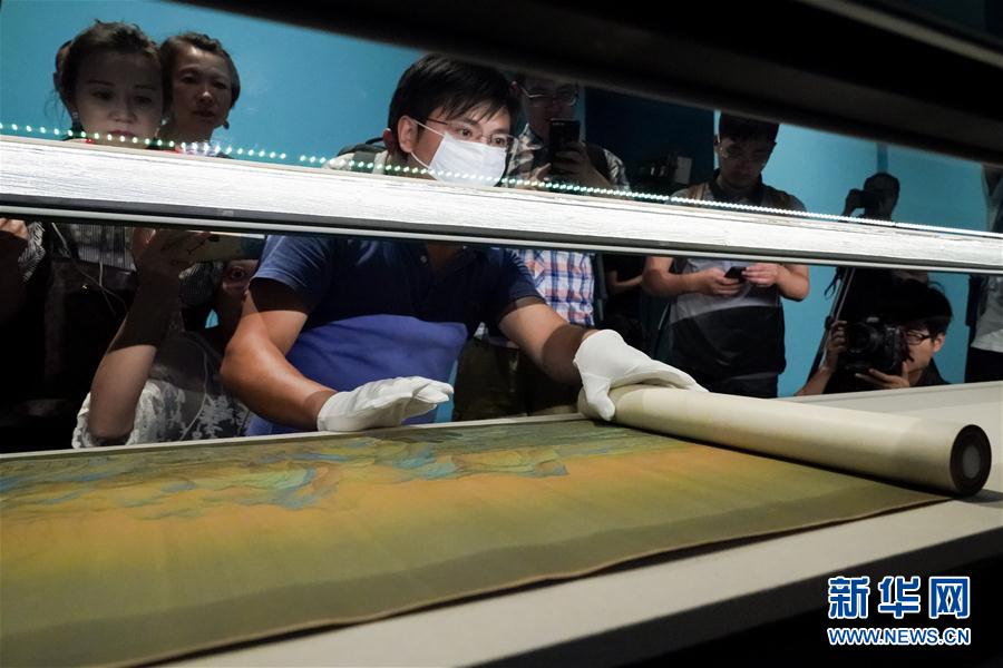9月11日,故宫博物院的工作人员将《千里江山图》布置到展柜中。 新华社记者 沈伯韩 摄