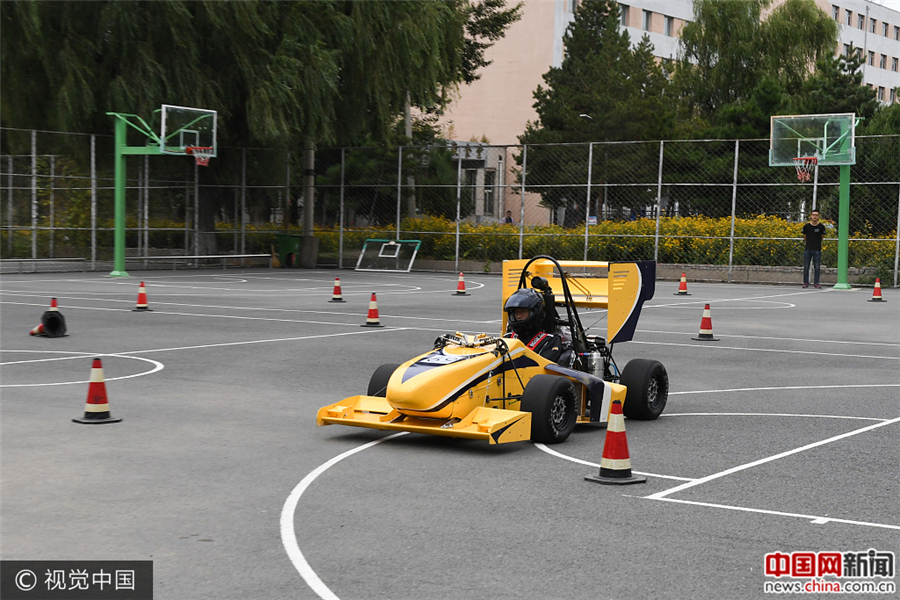 9月12日,一辆崭新的“F1赛车”亮相在长春大学校园内。这辆“F1赛车”的名字叫“FCC01”,时速可达到140千米/小时,是由长春大学3名老师和38名学生历时10个月制造而成的。全车1985个零件,其中1700多个零件是师生自己手工做成的,零件制作和日常开销共花费50万元。任闻鑫/视觉中国