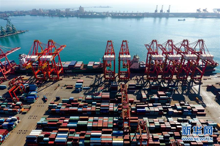 9月12日,在日照港三十万吨铁矿石码头,起重机在装载货物。