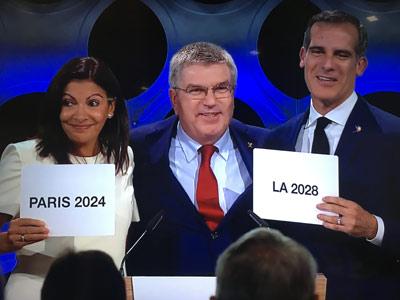 当地时间13日下午,北京时间14日凌晨,国际奥委会利马全会在分别听取了法国巴黎和美国洛杉矶的陈述报告后,集体投票通过这两座城市分别成为2024年和2028年夏奥会和残奥会举办城市。这也是最近几十年来,国际奥委会首次同时选出连续两届奥运举办城市。国际奥委会与双方分别签署了2024和2028年夏季奥运会和残奥会的主办权协议协议。