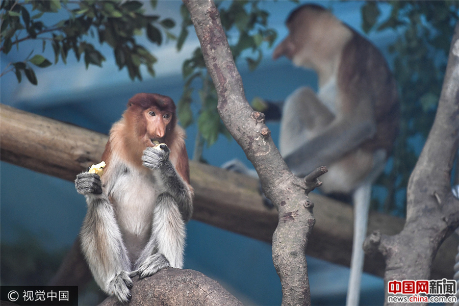 9月13日,大鼻猴在广州长隆野生生物世界大鼻猴雨林馆内生活。大鼻猴为东南亚加里曼丹岛的特有动物,名列《世界自然保护联盟》濒危物种红色名录濒危级别。这是中国首次引进大鼻猴,此次从印尼引进的大鼻猴一共有6只,分别来自两个家庭。1号家庭为一雄性、一雌性;2号家庭由一雄性和三只雌性组成。陈骥旻/视觉中国
