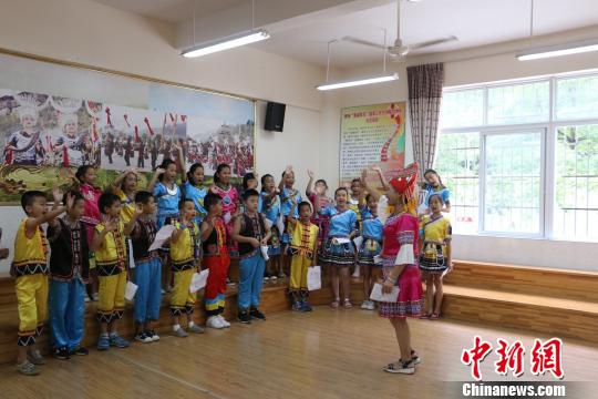 广西山歌王陆连芳和孩子们在课上对唱山歌 林馨 摄