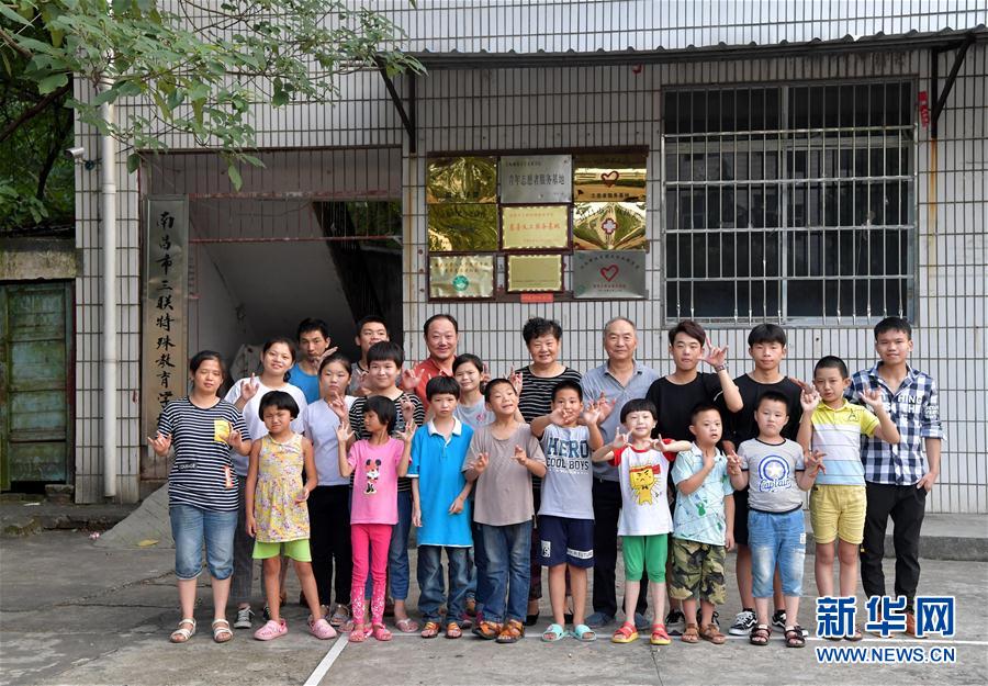 在南昌市青云谱区三联特殊教育学校,何兴武和学生们在一起合影(9月13日摄)。新华社记者 彭昭之 摄