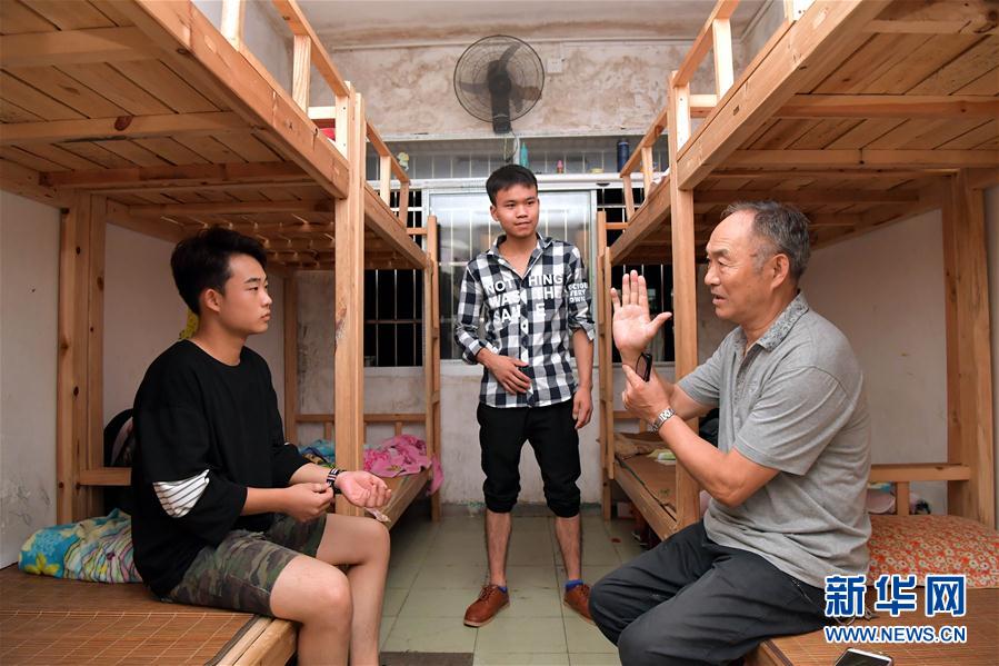 何兴武在学生宿舍和两个高年级学生谈毕业后的打算(9月13日摄)。新华社记者 彭昭之 摄