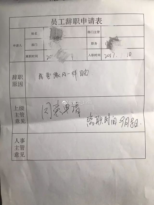 该辞职申请表上,“辞职原因”一栏,写的是“我要像风一样自由”。