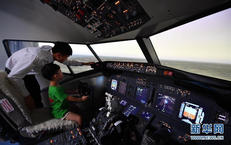 9月16日,一名小朋友在波音737模拟器上体验驾驶客机。当日,2017年全国科普日活动启动,海口航空科技馆举办免费开放日活动,吸引许多小朋友前来参观体验。新华社记者郭程 摄