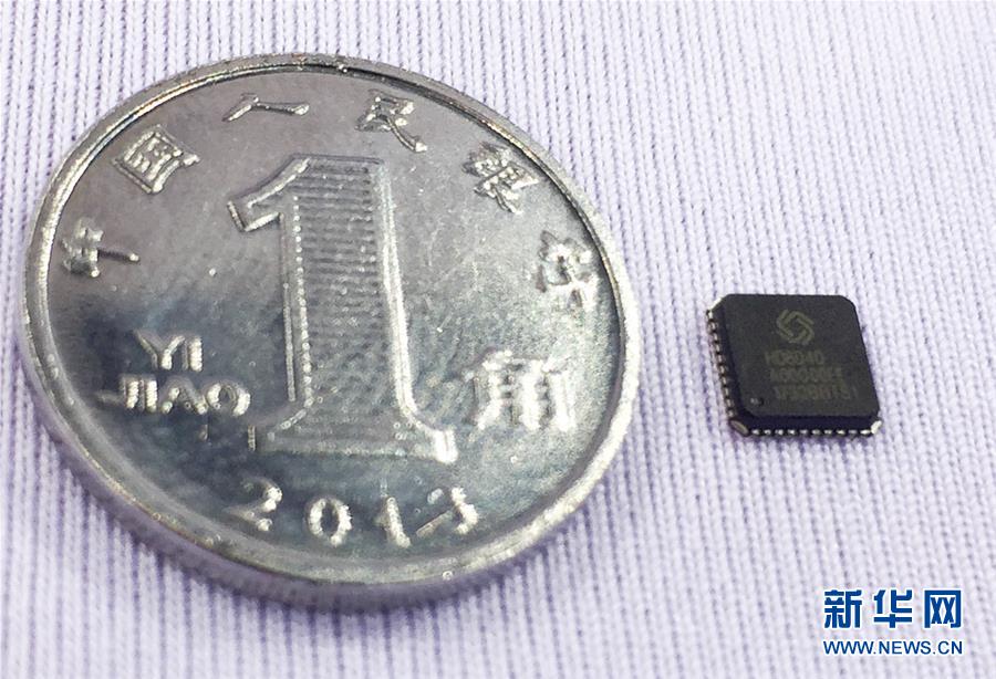 这是支持新一代北斗三号信号体制的高精度导航定位芯片与1角硬币的对比照片(9月16日摄)。