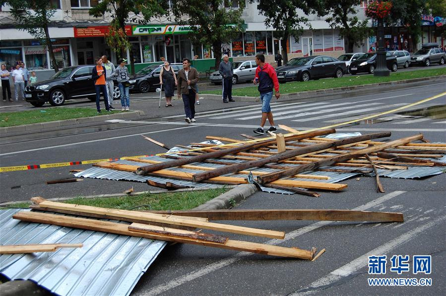 9月17日,在罗马尼亚雷希察,被大风掀掉的建筑屋顶散落在马路上。罗马尼亚内务部国务秘书拉伊德·阿拉法特17日对媒体说,罗西部地区当天下午遭遇强暴风雨,已造成8人死亡。新华社/罗通社