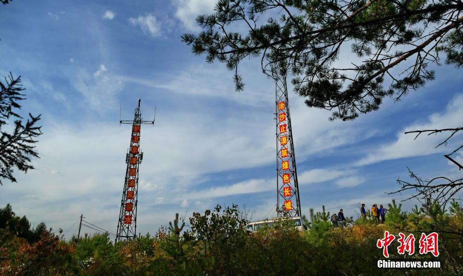 塞罕坝林场三代人55年的坚持坚守建设了世界上面积最大的人工林,创造了沙地变绿洲、荒原变林海的“绿色奇迹”。以实际行动诠释了“绿水青山就是金山银山”的理念,是当代中国绿色生态文明的奇迹。55年中,三代塞罕坝人将昔日飞鸟不栖、黄沙遮天的荒原,变成112万亩世界上最大的人工林海,创造了人间奇迹。如今的塞罕坝,生态效益显著:单位面积林木蓄积量是全国人工林平均水平的2.76倍,全国森林平均水平的1.58倍。塞罕坝每年为京津地区输送净水1.37亿立方米,释放氧气55万吨,成为守卫京津的重要生态屏障。塞罕坝机械林场集造林护林、森林旅游、苗木生产、林产品采集加工于一体,成为了环境社会经济效益良好的绿色发展生态文明建没典范。图为矗立在与内蒙古界河交界处铁架上的标语上写着“治沙止漠筑绿色长城 护卫京津送清风碧水”。中新社发 乔天富 摄