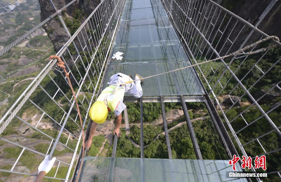 9月18日,在湖南平江石牛寨180米高空上,4名玻璃桥维修工人头顶烈日,正在对景区内的全透明高空玻璃桥进行大型全面检测、安全维护及更换玻璃等工作,以此备战即将到来的国庆中秋假期。杨华峰摄