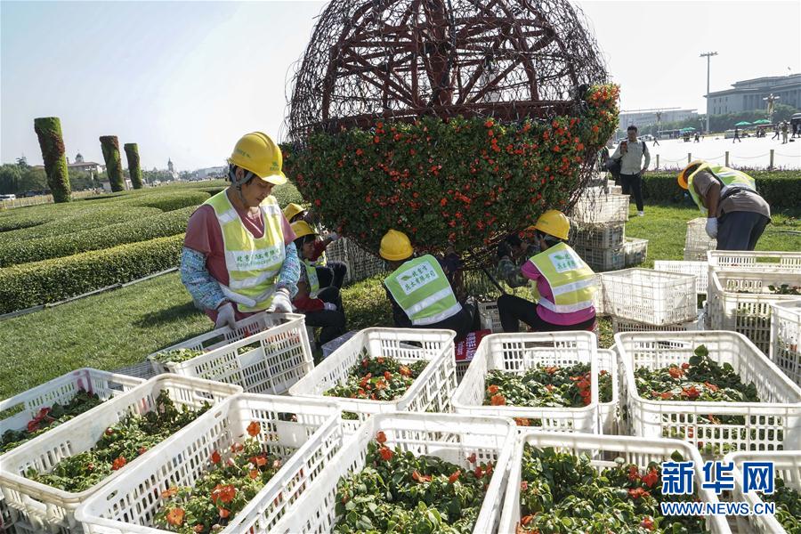 9月18日,工作人员在天安门广场布置花卉。当日,天安门广场国庆花卉布置工作开始。据介绍,国庆期间天安门广场中心将布置“祝福祖国”巨型花篮,东西长安街将各摆放7组花坛。新华社记者殷刚 摄