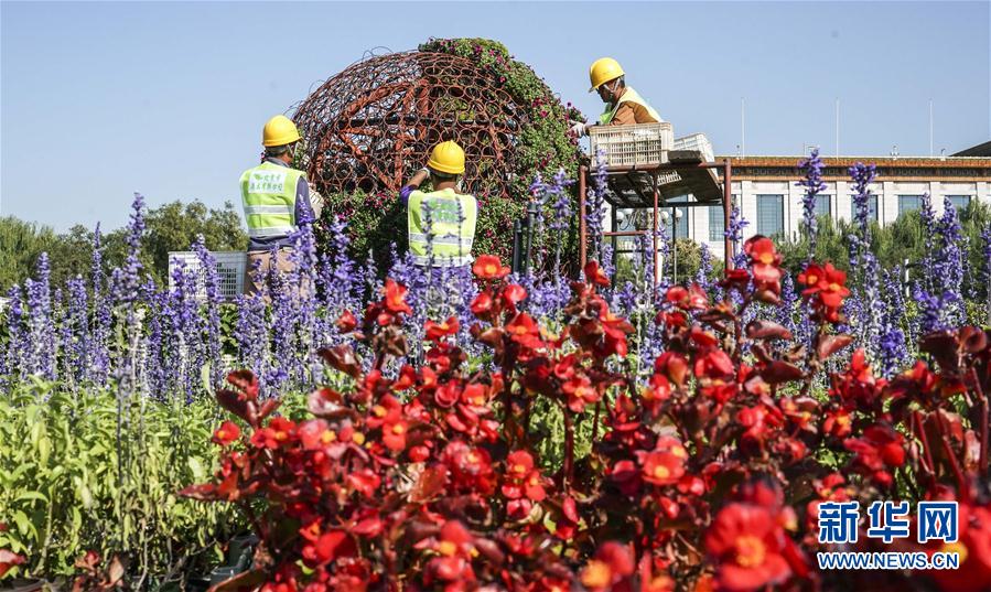 9月18日,工作人员在天安门广场布置花卉。当日,天安门广场国庆花卉布置工作开始。据介绍,国庆期间天安门广场中心将布置“祝福祖国”巨型花篮,东西长安街将各摆放7组花坛。新华社记者殷刚 摄