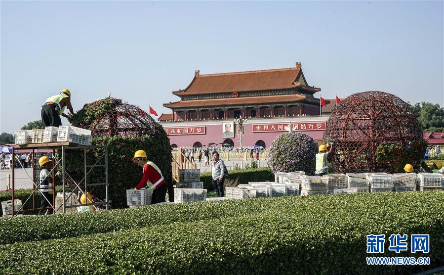 9月18日,工作人员在天安门广场布置花卉。当日,天安门广场国庆花卉布置工作开始。据介绍,国庆期间天安门广场中心将布置“祝福祖国”巨型花篮,东西长安街将各摆放7组花坛。新华社记者殷刚 摄
