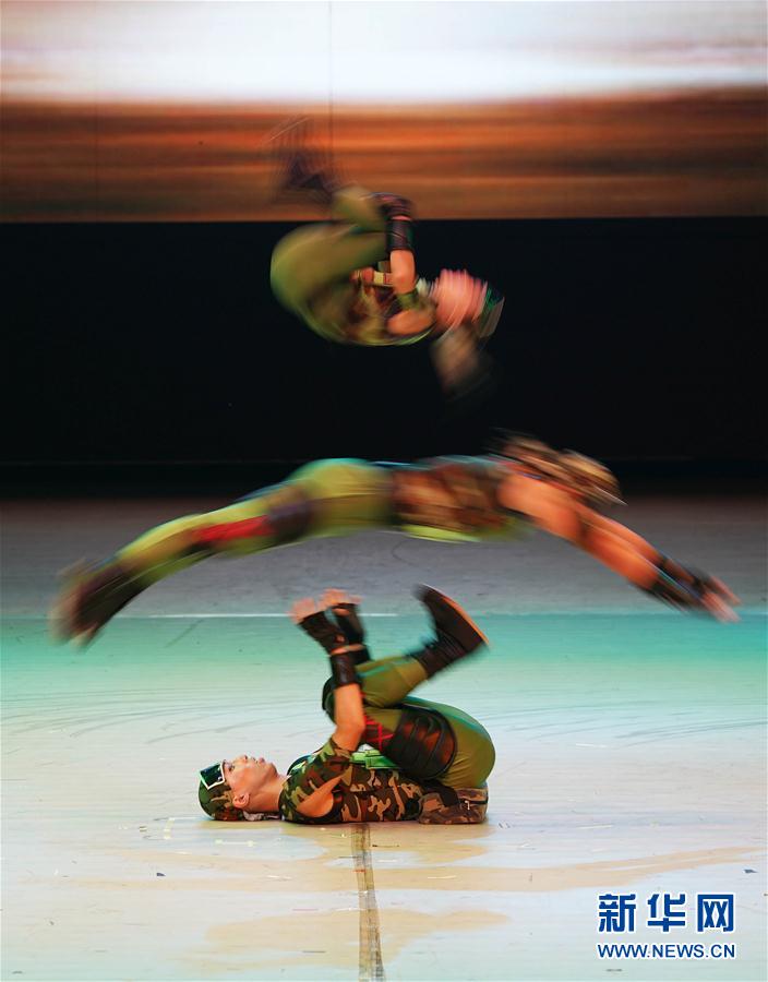 9月17日,在山东省蓬莱市欧乐堡大马戏剧场举行的第十届中国杂技金菊奖全国杂技比赛上,济南市杂技团演员表演《勇者无惧—蹬人》。