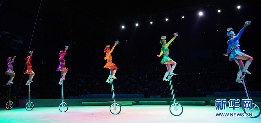 9月18日,在山东省蓬莱市欧乐堡大马戏剧场举行的第十届中国杂技金菊奖全国杂技比赛上,内蒙古民族艺术剧院杂技团演员表演《六人踢碗》。
